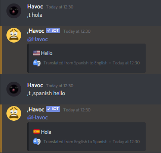 Another commonly used command is the translate command which works by making use of Google Translate as shown below you it will translate messages into English by default or into another language specified by a flag.
