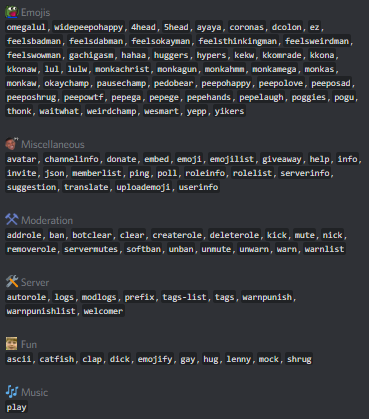,Havoc has a variety of commands the following categories: moderation, miscellaneous (or utility), emojis, server, fun and music.