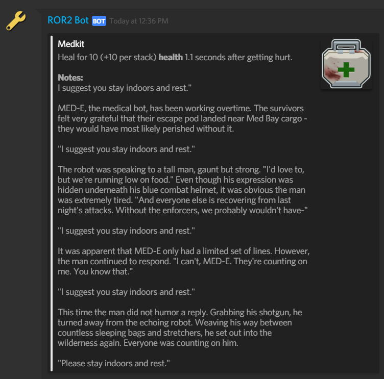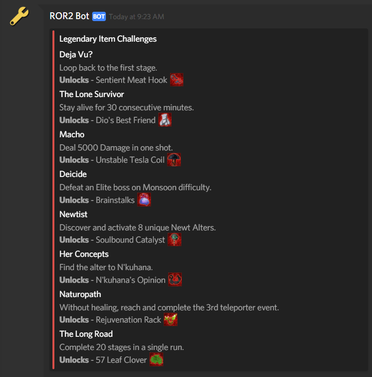 ROR2Bot is a bot full of information on the new game Risk Of Rain 2 The bot includes information on every item, character, and monster currently in the game and as more is added to the game more will be added to the bot