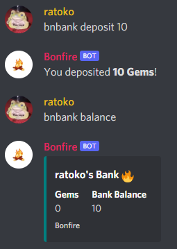 • bnbank [deposit / withdraw / balance]* [Gem amount] -> Put Gems in, and get more out!
