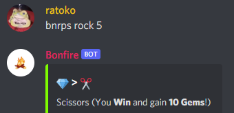 • bnrps [rock / paper / scissors]* [Gem amount] -> Play rock, paper, scissors, and gamble for more Gems!