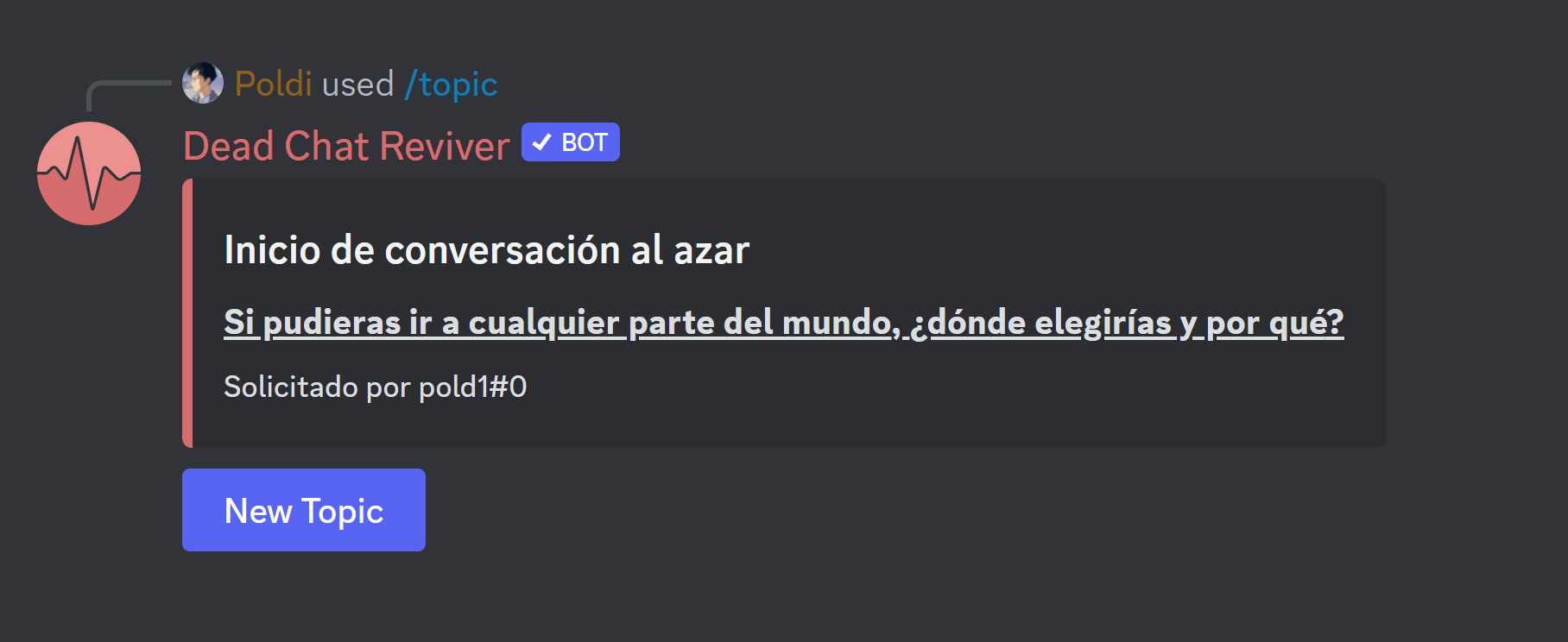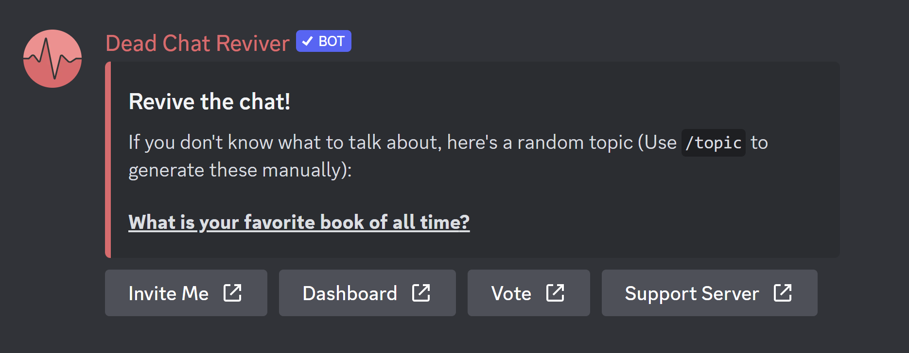 its pretty simple and its a nice bot but the topics start to run out and repeat. they also arent the most interesting ones. i think it'd be perfect if you could customize the topics or add in a custom revive message but rn its kinda boring and not too effective in getting a topic going.