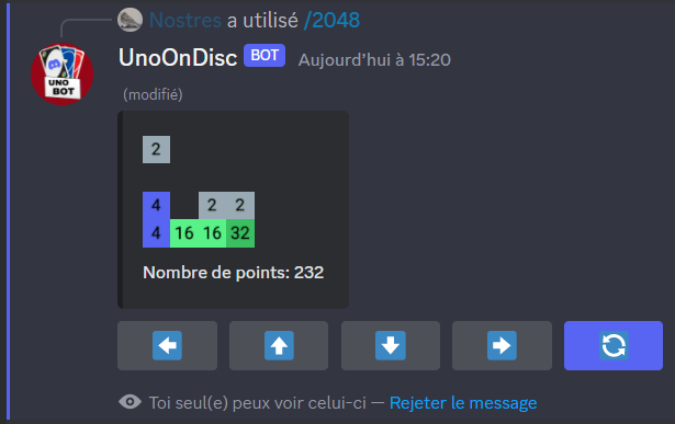 Super pour jouer au UNO. Honnêtement après avoir testé divers bots uno, celui-ci a la meilleur ergonomie, la meilleur personnalisation et est simple à comprendre. De plus, le jeu du 2048 qui se joue en solo et qui est aussi jouable en message caché pour attendre les autres joueurs au uno dans un tournoi par exemple ça ajoute quelque chose.