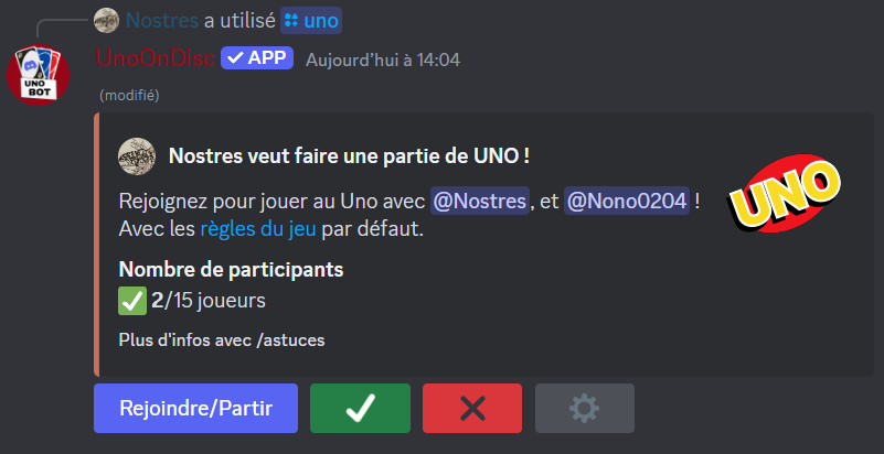Hey ! Vous cherchez un bot pas piqué des hannetons pour jouer avec les membres de votre Discord ? Organiser des tournois directement sur la plateforme ? Alors pourquoi ne pas jouer au UNO ? Avec une ergonomie digne de ce nom, qui a été pensée pour s'adapter aux différents formats: ordinateur, mobile et tablette ! Si vous souhaitez pouvoir jouer au UNO, UnoOnDisc est le bot qu'il vous faut ! En effet, vous pouvez jouer au UNO directement sur Discord jusqu'au nombre de 15 grâce à la commande /uno qui vous permet de lancer une demande de partie :