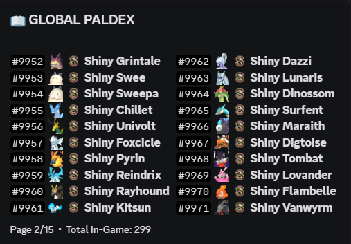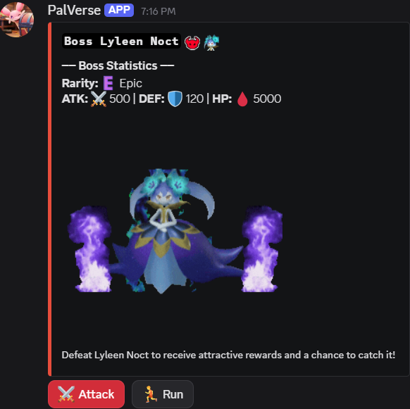 /spawn - Search the wild for a Pal to catch./hunt - Pay a fee to hunt high-rarity Pals using weapons./team - Manage your active battle squad (Max 5 Pals)./paldeck - View your entire collection of captured Pals./tower - Enter the Tower to face progressive challenges./pve - Challenge powerful Bosses.[ 💰 Economy & Items ]