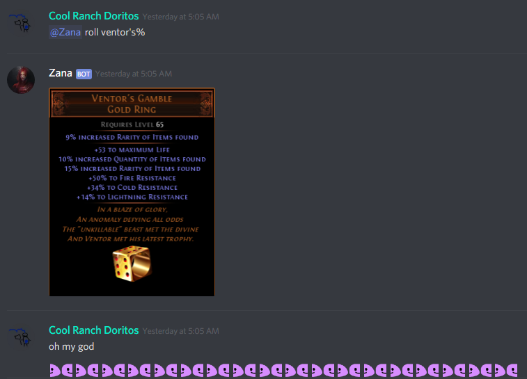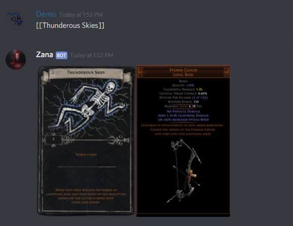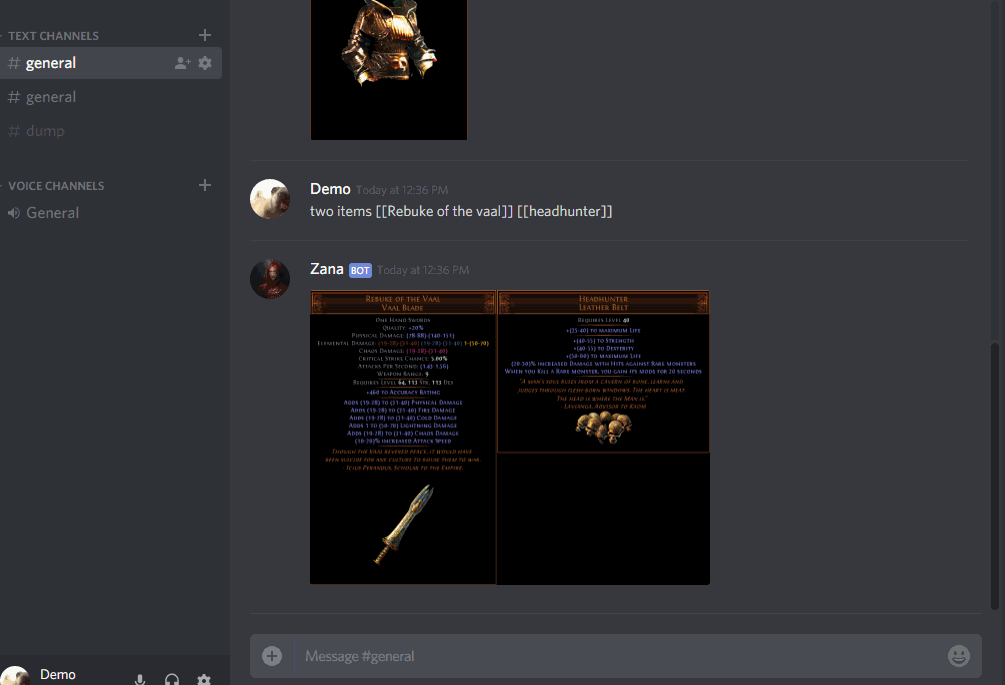 5. Convert items from PoETradeMacro to Zana's general image form, very similar to PoE wiki, when you copy an item from PoETradeMacro It's very ugly, and can take up a lot of unneeded space in a chat, now you can paste it in chat and not worry at all, as Zana will read the item and transform it into an image and delete your old message