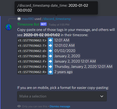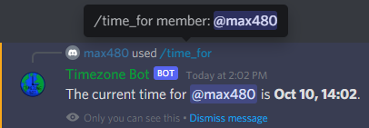 /detect-timezone - gives a link to a page to figure out your timezone/set-timezone [tz_name] - saves your timezone for other commands. You should use the format given to you by /detect-timezone (for example Europe/Paris) because it handles switching between summer and winter time nicely, but you can use "UTC+3" or "EST" as well./remove-timezone - deletes your timezone from the bot's database/discord-timestamp [date_time] - gives a Discord timestamp, to tell a date/time to other people regardless of their timezone/time-for [member] - gives the time it is now for another member of the server (if they have a timezone configured) and the difference with the time it is for you. You can also see someone's local time by right-clicking on them (or tapping them on mobile), then selecting Apps > Get Local Time./world-clock [place] - gives the time it is in another place in the world (a city or a country) and the difference with the time it is for you/list-timezones - lists all members on the server with a timezone configured, sorting them by timezone with local time for eachThese slash commands issue private responses, so they can be used from anywhere without cluttering a channel with commands.