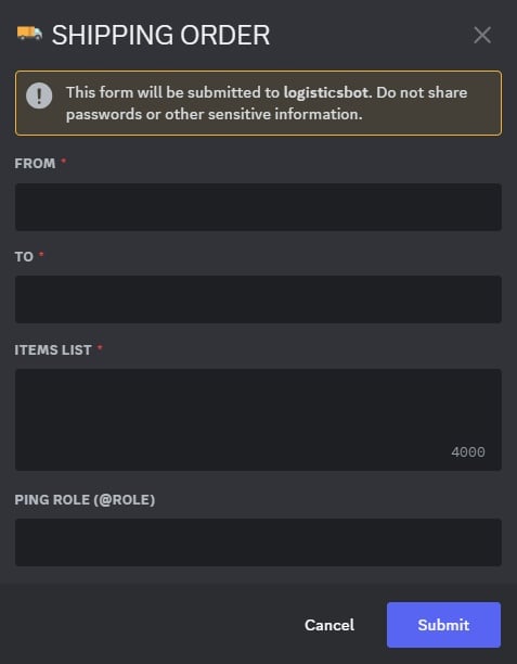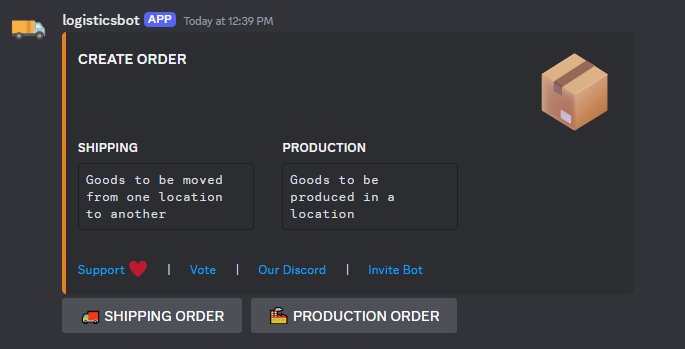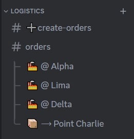 When LogiBot is invited, run the "create-channels" commmand which will create 2 channels: 1 - For the embed where orders can be created by pushing the buttons 2 - A log channel where orders will be sent