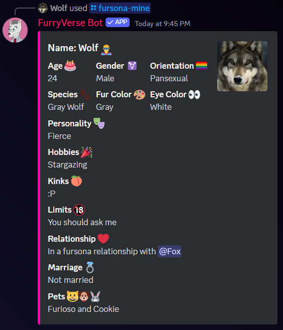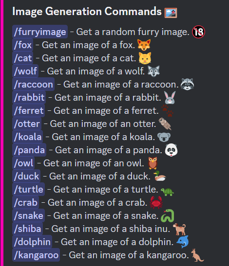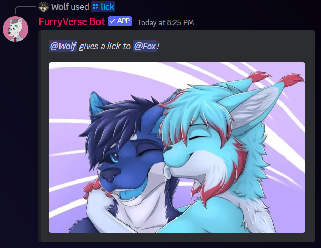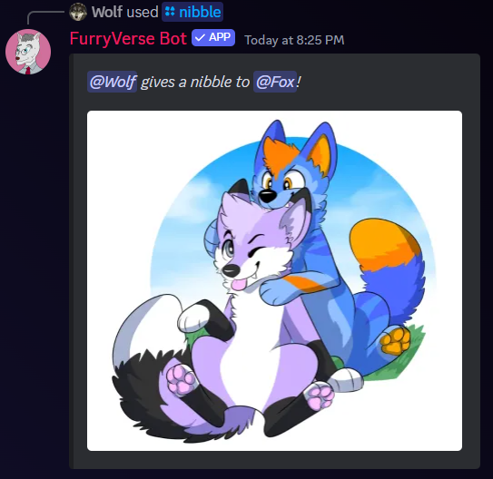 FurryVerse is the ultimate Fur Bot with Tons of Commands! Fursonas, Pets, Loads of Animal/Furry Images, Relationships, Hugs, Nibbles & More!