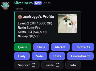 /profile [user]: View your own or another user's profile • Level & XP towards next level, rank, number of skins owned & their value, and money