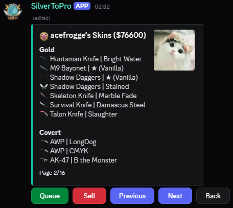 /sell: Sell all of the skins you own • Selling price of skins increases with rarity: $1, $2, $20, $100, $200, $500, $1000, $5000