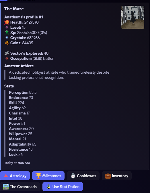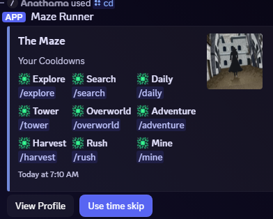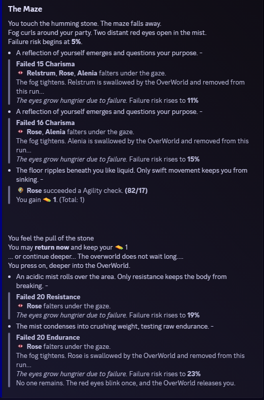 /explore — Generate new maze locations via seeds /tower — Climb escalating risk floors with your party! /overworld — Party stat-check expeditions /adventure — High-risk combat runs /search — Quick way to generate in game resources /daily & /weekly — Timed resource injections