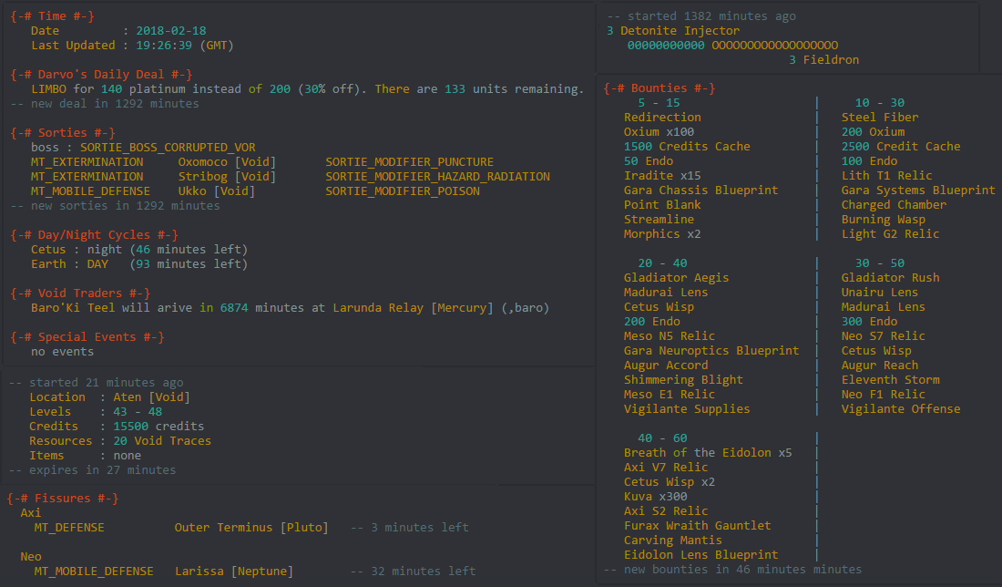 May my data stores be of use to you. A Warframe bot with droptable information/mission trackers.