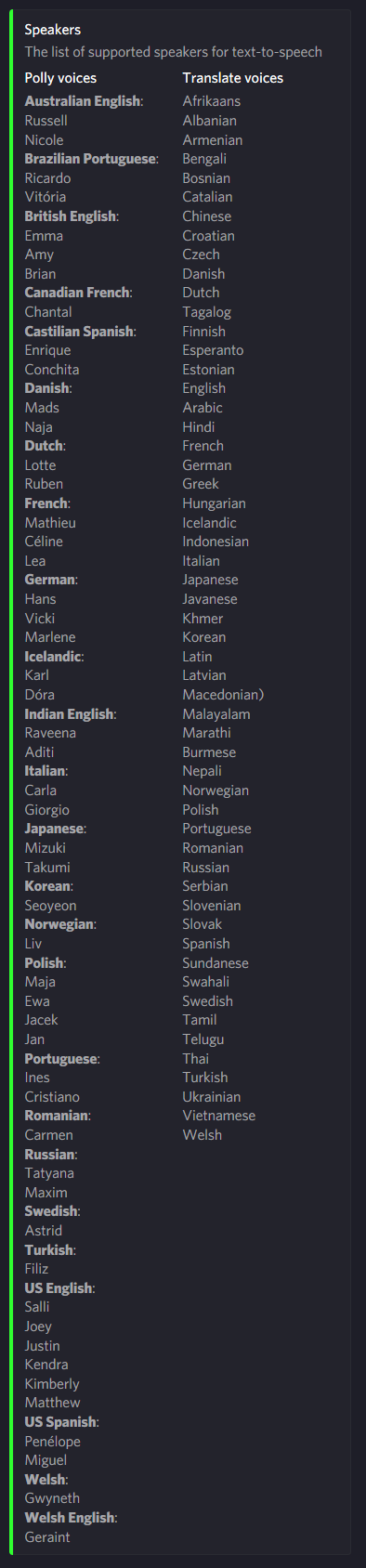 A TTS (Text to speech) and translation bot with support for 104 different voices and 100+ languages