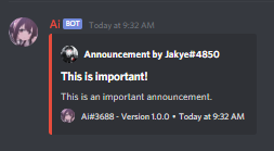 Ai has an advanced announcement command, which you can use to customize your announcement's title, embed color, and even add an image.