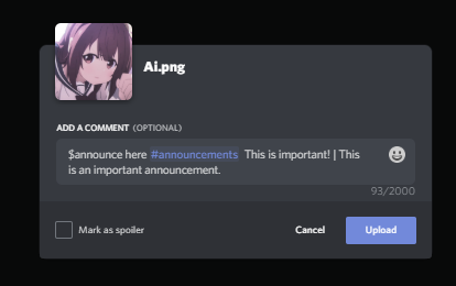 The usage is: $announce [announcement ping type : everyone : here] <channel mention / channel id> <title | content> [upload image]