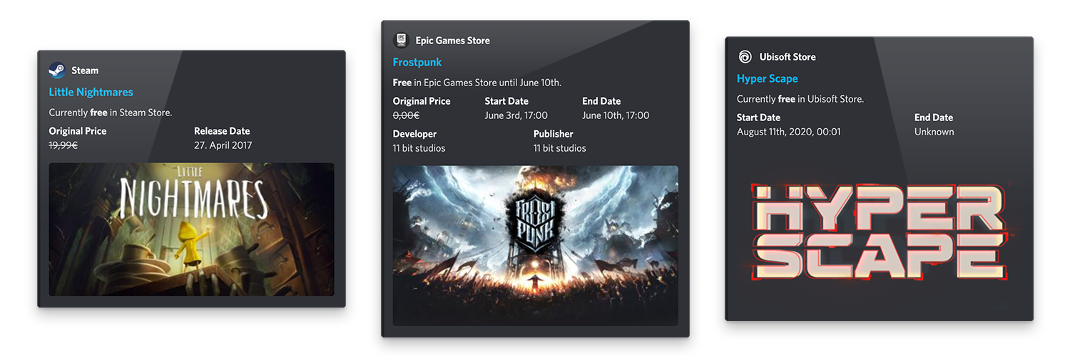Notifications from various sources: -Free Steam Store Games -Free Epic Games Store Games -Free Ubisoft Store Games