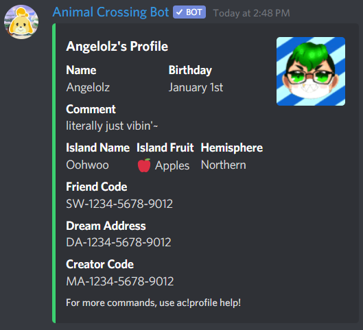 This bot is primarily focused on giving you useful tools for Animal Crossing: New Horizons. Features of this bot is shown below!