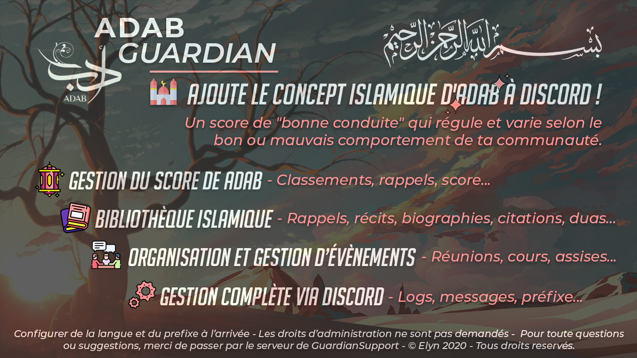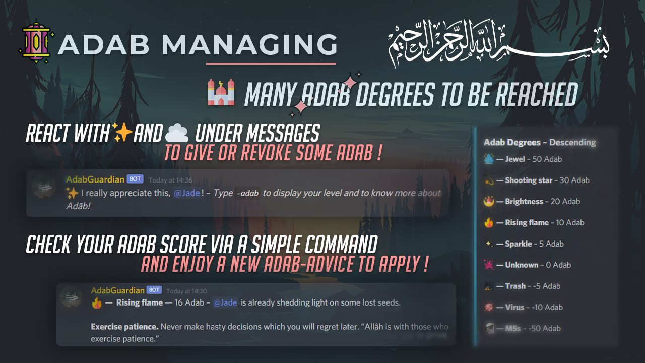 | Adab @mention | Affiche son niveau d'Adab (ou celui du membre mentionné) ainsi qu'un rappel à appliquer - Issus de différents ouvrages traitant du thème. |