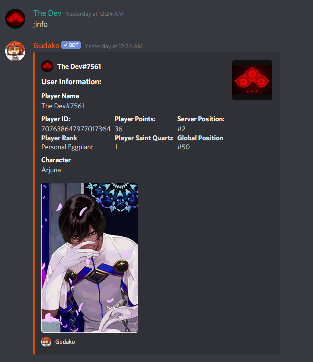 Shows the name, ID, Points, Saint Quartz, rank and avatar of a player. If there is no user it will show the informantion of the author of the message.