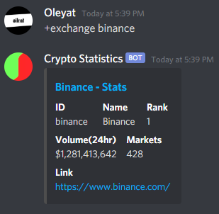 This bot uses the coincap.io api which supports more than 1500 crypto currencies and 70 exchanges. As of now you are able to view basic information of the exchanges.