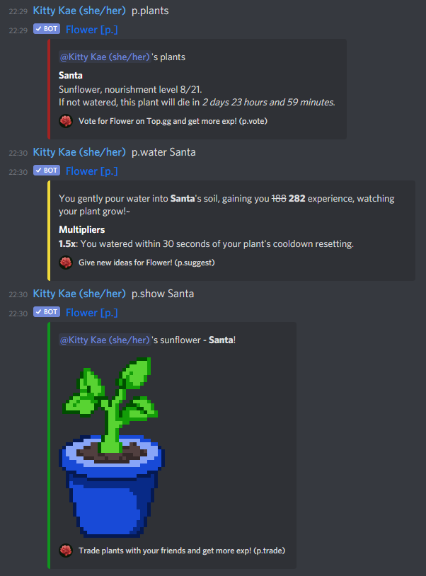 Flower is a tiny bot for growing and taking care of flowers. Discord can be a scary place, so it's nice to always have a flower garden for you to come back home to.