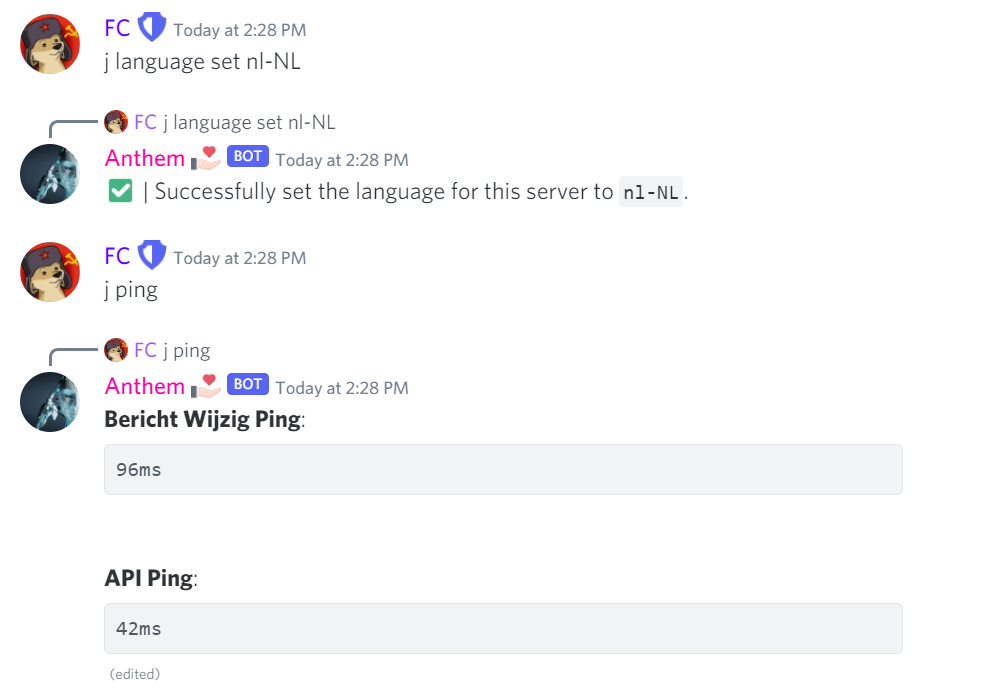 Anthem supports 9 languages, listed below, which you can configure for your server and bot will communicate in this language only. However, translation for some of the commands is not complete yet. So the bot might respond in American English, which is the default language.