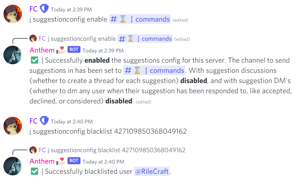 Anthem has a powerful suggestion system. Allowing you to blacklist/whitelist users from suggesting, configuring the creation of threads under each new suggestion for discussions, whether to DM the user when their suggestion has been responded to - such as accepted, declined, etc.