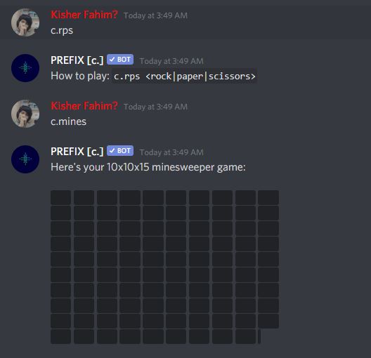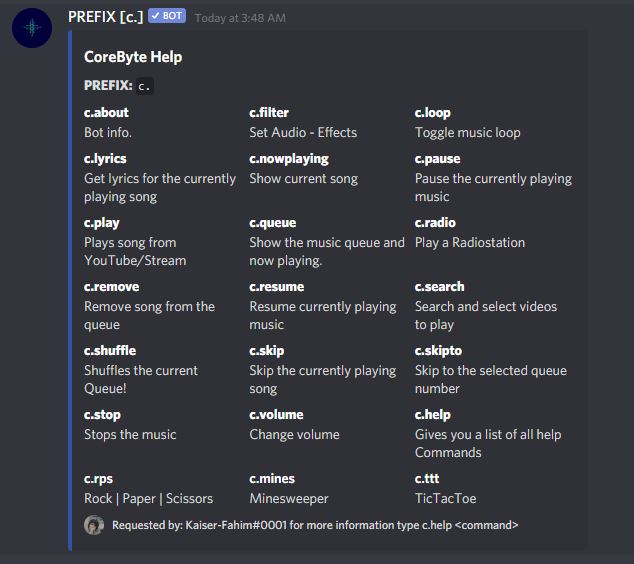 This bot is a Music and Minigames Bot which is made by Kaiser-Fahim. It have so many option in Music. You can play music after that you can change the music filter instantly. Filters like: 8D,bassboost,nightcore,surrounding and Many More. I will add more filters also. It have Radio also. You can play minigames Like Rock Paper Scissors, Minesweeper, TicTacToe. I still developing it day by day i am going to add welcomer too. I can Also Add Reaction role, Advanced Ticket System and other Moderation Settings if i get enough support.