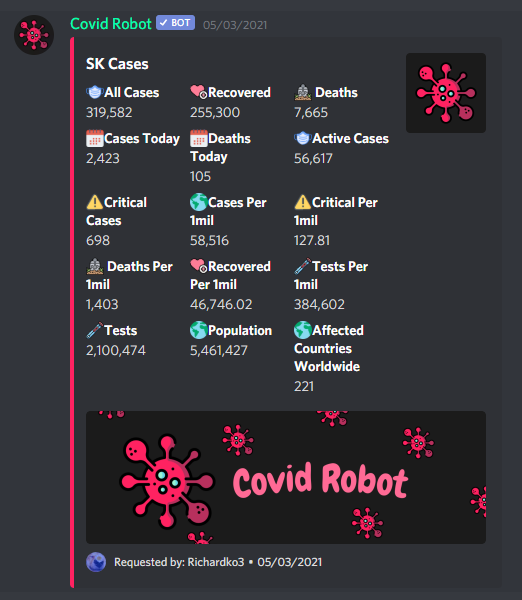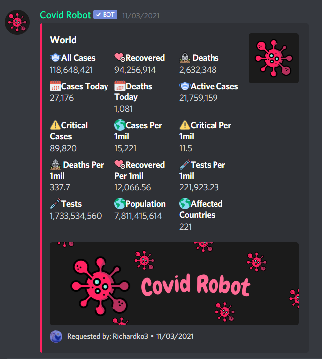 Covid Robot Is Very Good And Helpful My Members Love Him. I Have Him In 5 Of My Servers!