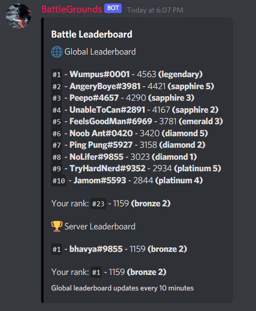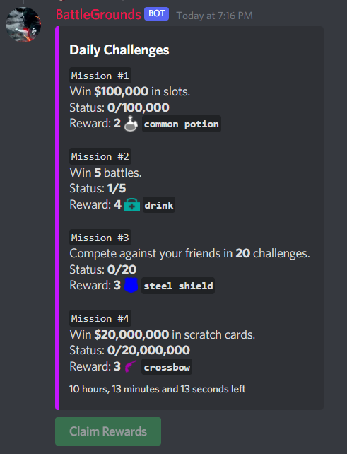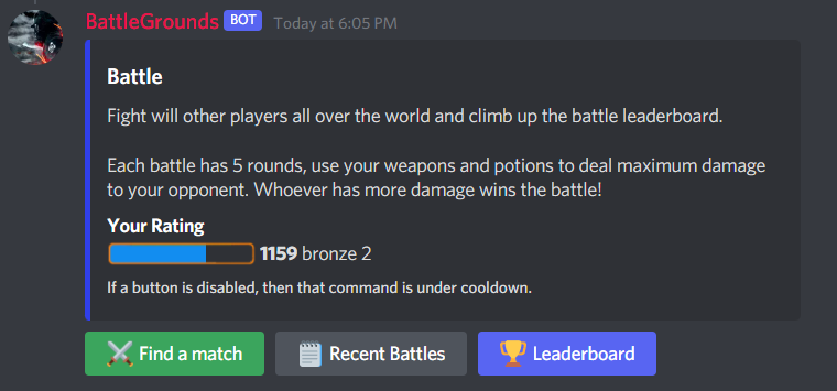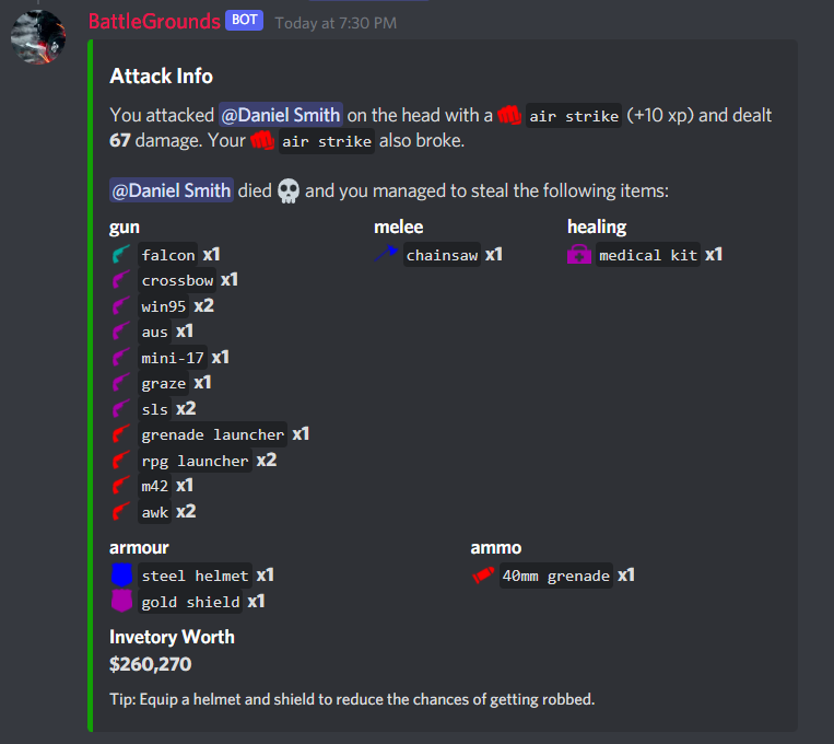 BattleGrounds is a fun economy bot where you can buy and open boxes to find guns and ammunition, complete missions, attack your friends and rob their guns and money. Team up with your friends and enter dungeons. Test your skills globally in our multiplayer battle mode and climb up the leaderboard.
