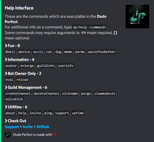 Dude Perfect is just another Discord bot, he is upgrading day by day to bring a smile to your face. Dude Perfect can do most of the things which you require for making a super duper awesome Discord server. We are currently focused on certain modules for each version. Here, we make it our passion to provide you the best Discord bot ever with all awesome features.