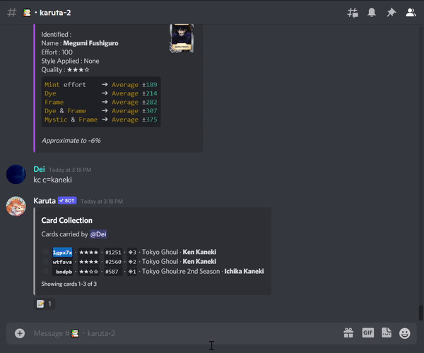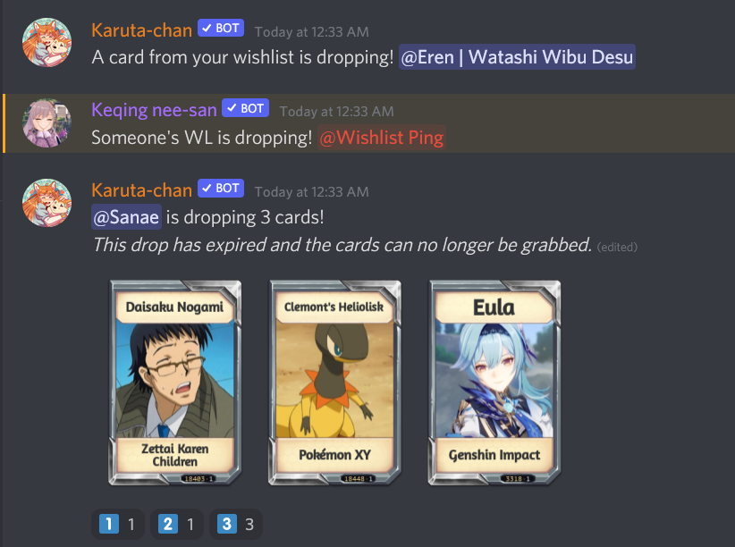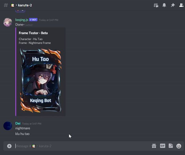 Keqing bot is a FREE utility bot, made to help karuta players to calculate their cards effort also comes with built in frame tester, wishlist ping, card codes generator etc. There will be many more of new features to come