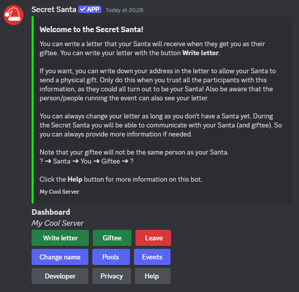 /setup you are guided through all the possible configurations./create Create an event./setup Start setting up an event. Automatically creates an event if it doesn't exist yet./start Start the event./reset Reset the event, allowing you to redo the raffle./end End the event/destroy Destroy the event, and with that all data from the database./pool create/delete/edit/etc Manage pools with these commands./list Get a list of all your participants, or one of many filtered list, like who has yet to submit a gift./info Get information on a specific participant, like who their Santa is./peek Get a layout of your participants, showing who has who as their Santa./spreadsheet Generate a spreadsheet with information on all participants./ban Ban the participant from the event (not from the server)./dm DM a participant using the bot./latecomers insert Insert a latecomer in-between a Santa-giftee pair./latecomers assign Assign a group of latecomers to each other/manipulate force/deny Force/deny a Santa-giftee pair to occur in the raffle./swap Swap the giftees (and optionally Santas) of two participants./word Set the word to use for Santa. For example: Host a Secret Valentine instead!/role Set the role that is automatically given to server members who join./welcome Set the message shown to new participants/letter-required Require participants to write something about themselves for their Santa to work with./submit-type Set how gifts are submitted. Online, by address, both, or neither?/latecomers allow Whether latecomers are allowed to join./reveal channel Set the channel where the gifts will be revealed, or have them appear in DMs instead./reveal what What to reveal in a reveal channel. Only the text, the attachments, or both?/reveal names Whether to reveal the names right as the gift is received./logs select Select the events to be logged in a set channel./logs ping Set which event logs should ping a set role.4.25