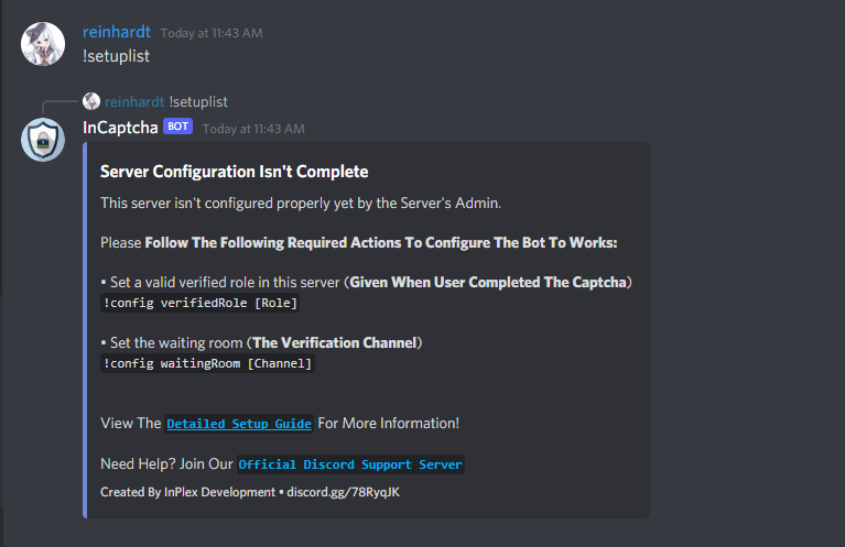 To ensure you configured everything correctly, run !setuplist again to confirm.