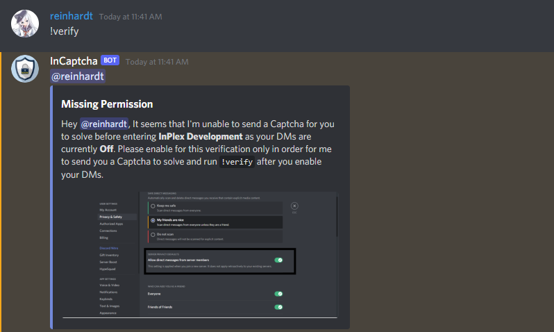 When a user DMs is disabled, the bot will ping them on the waitingRoom channel to enable the DMs in order to solve the Captcha. They also need to run !verify manually for a new Captcha.