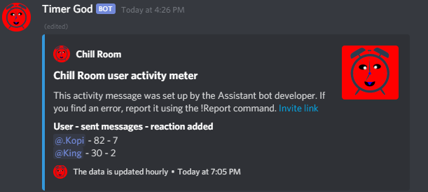 With this discord bot you can set an unlimited number of timers, both for your server and for private. In a lot of situations, this can help, I say this from experience. In addition, you can make an unlimited number of custom embeds, for example, to ask for help. Also, an activity meter has been built into the Discord Bot, which counts how many messages users have sent and how many times they have reacted to messages.