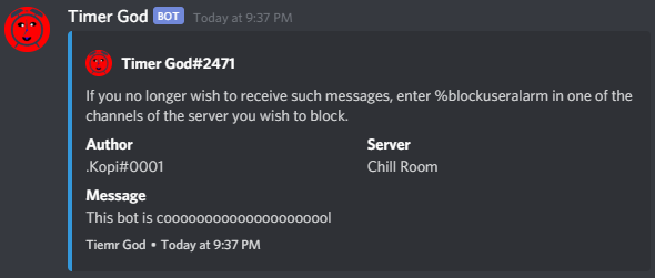 -> Use this command to set a timed message for any channel (%deletealarm to remove the alarm)