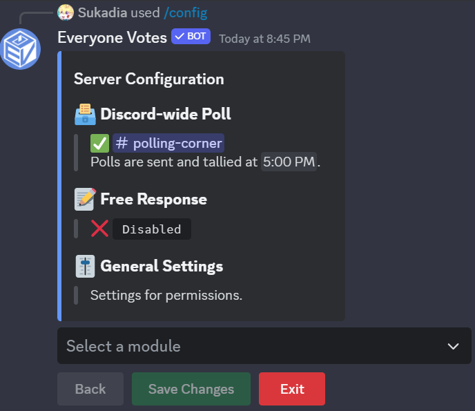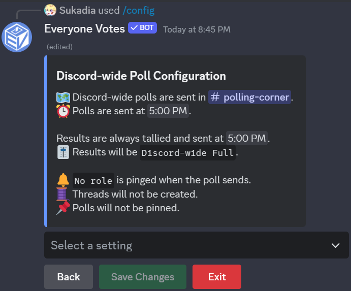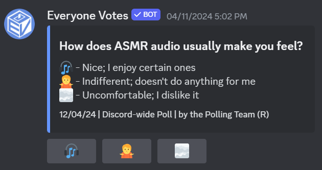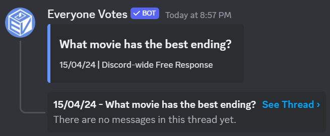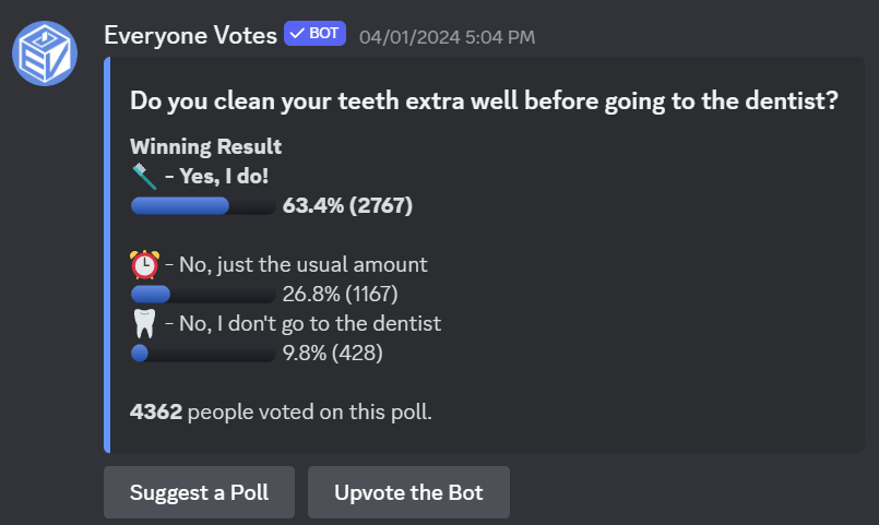 Everyone Votes sends a daily poll to thousands of servers and tallies the results Discord-wide for everyone to see.