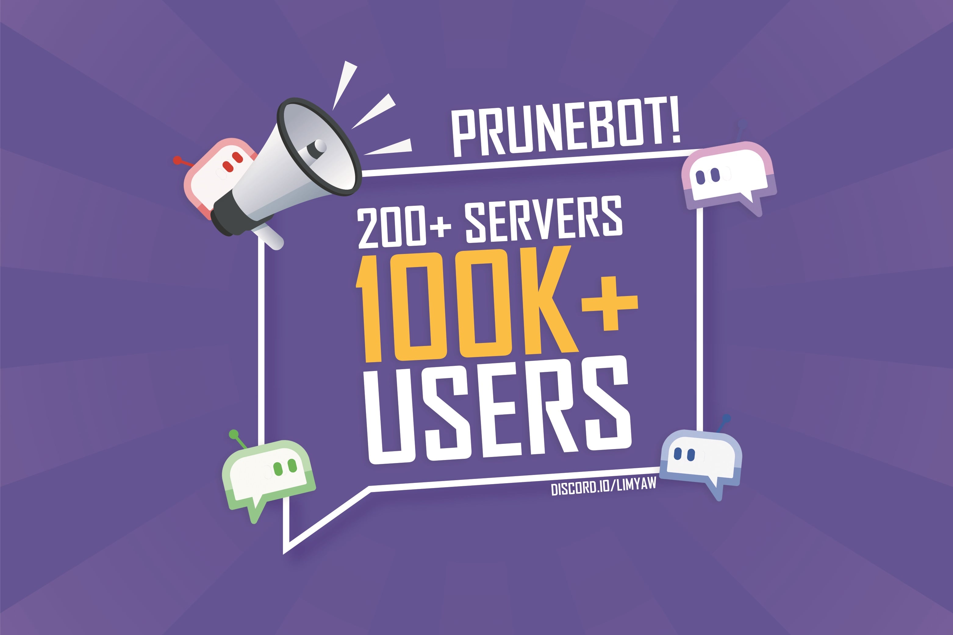 setprefix, and more coming soon!ban, kick, warn, mute, createchannel, createemoji, and 9 more!weather, aes256, embed, enlarge, and 4 more!urole, unorole, kole, knorole, fetchhelp, uptime, vote, channel, stats, whois, and 5 more!play, loop, skip, stop, jumpto, volume, and 4 more!gstart, gend, grerollcat, changemymind, gay, trigger, circle, and 7 more!8ball, reverse, snipe, and 4 more!PruneBot Main is the only verified bot at the moment, If you're encountering issues with the main bot due to a lot of users feel free to use other versions of PruneBot there are 3 alternative PruneBot(s) the Blue, Green and Red this bot is currently not verified and can only handle up to 75+ Discord servers. If you can no longer use any of this alternative bots to your server due to limited invite please kindly contact me to our Discord Server.