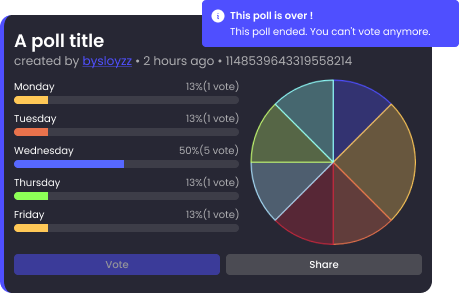 Define a title, as well as different choices, nothing could be easier. Create your surveys with slash commands. As many choices as possible, allow multiple answers, also keep the votes under the annonym.
