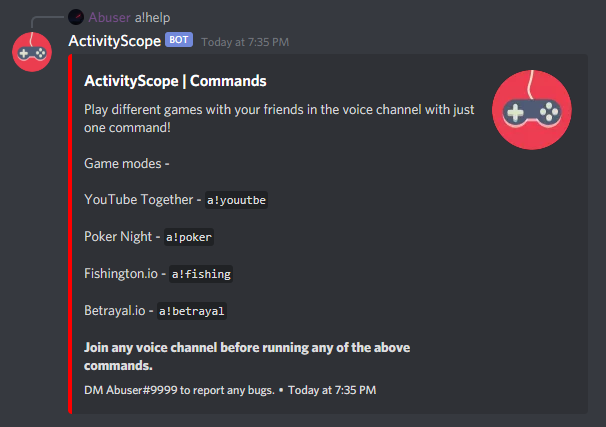 a!betrayal - Starts a Betrayal.io game session in the voice channel.