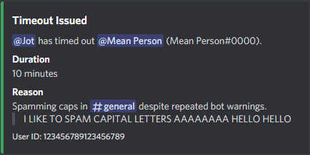 I honestly believe that Jot is the best moderation bot I know of and/or have ever used. It's got a variety of extremely useful features and the developer is a really nice person who is active in fixing issues with the bot along with adding more quality of life features. Bottom line here is that its a quick, responsive, and user-friendly bot with great features, and a great developer as well.