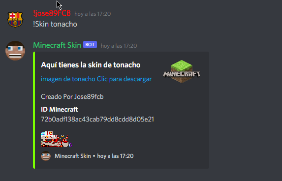 Con este bot podras generar cualquier skin y e ID de minecraft con tan solo escribiendo el usuario de minecraft por ejemplo: !Skin tonacho un bot muy simple de usar, es mi primer bot espero que os guste . este bot está en español, quizas en algun futuro tendra multi lenguajes☺, espero que os guste un saludo!