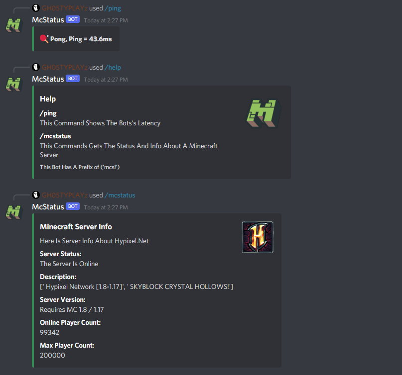 This Is A McStatus Bot Which Shows If A Minecraft Server Is Online And Its Info