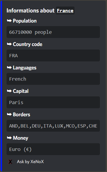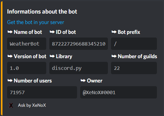 /weather "location" : gives the weather forecast for the given location /bot : gives informations about the bot /ping : gives the latency of the bot /country : gives informations about country/setprefix "prefix" : change your prefix/prefix : gives your prefix/bot