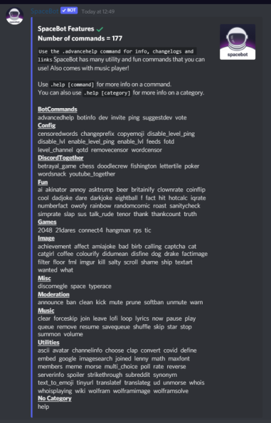Space Bot Is Epik Very Epik It got soo many commands to try its a very useful bot if you want a bot with every features you should invite spacebot
