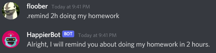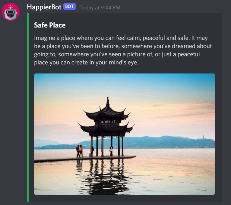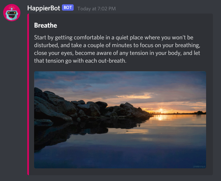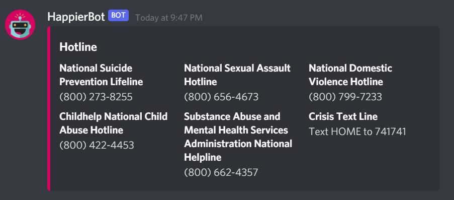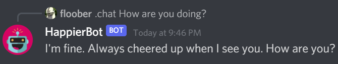 HappierBot is unlike any other Discord bot. I was designed to keep communities and discord servers positive using an Ai chatbot. Using the .chat command you can talk to the bot about anything! It can have conversations, tell jokes, and even share inspirational quotes. HappierBot also has resources for getting help and information on mental health problems.
