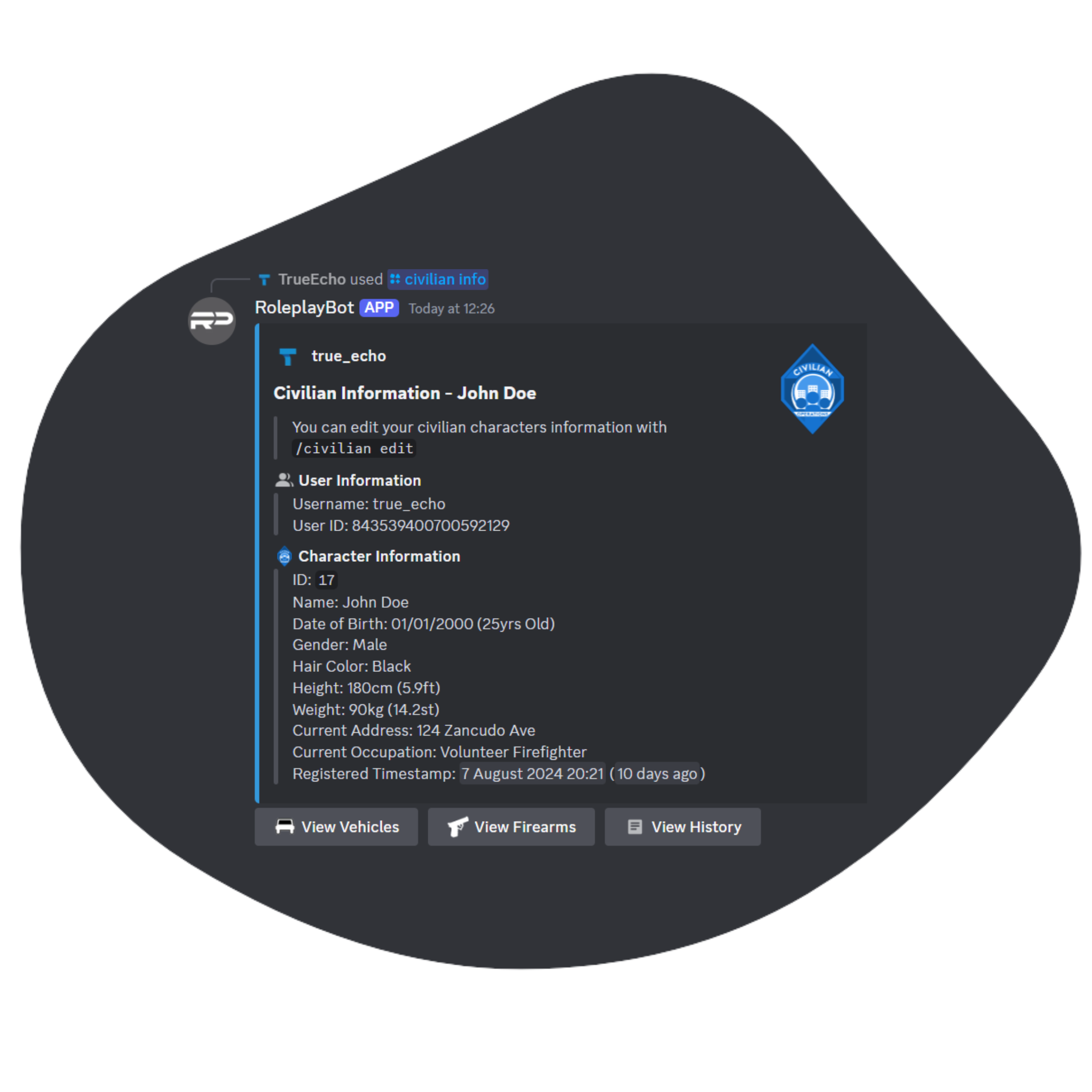 We offer the most advanced, discord integrated CAD/MDT system possible. With our Civilian Module you can use many customisable and advanced commands to create your own civilian character, register firearms and register vehicles. All of our modules also work hand-in-hand which allows for Law Enforcement to arrest, fine and lookup these civilians.