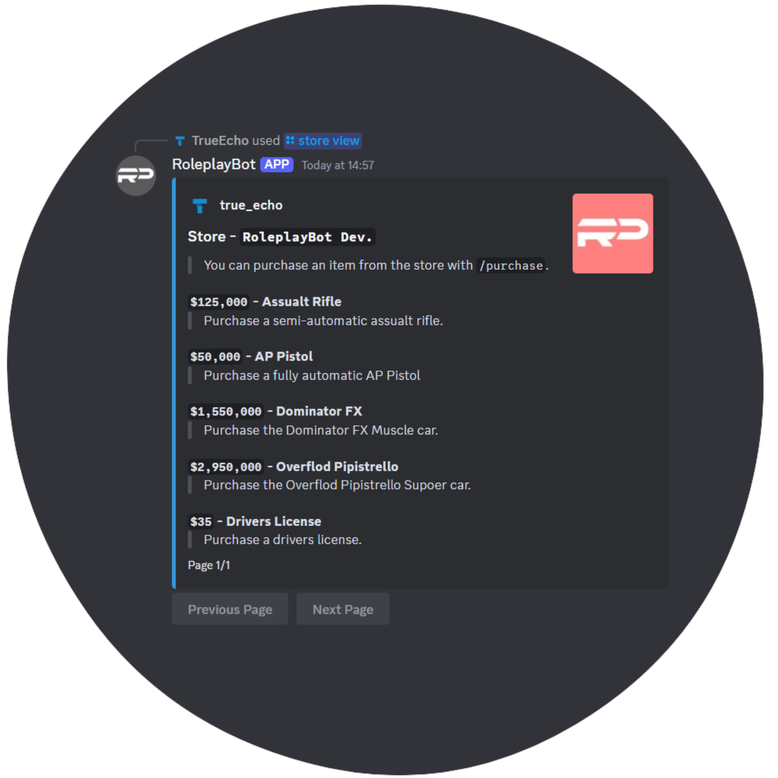 Use RoleplayBots completely custom and fully integrated economy system, no longer do you need third-party bots to operate your servers economy. Packed full of roleplay specific features such as the ability to pay impounds, fines and citations directly along with a never seen before feature which allows you to import and export your servers store. The import export system allows you effectively copy a servers store and paste it into a new server, a feature that was highly requested in the roleplay community.